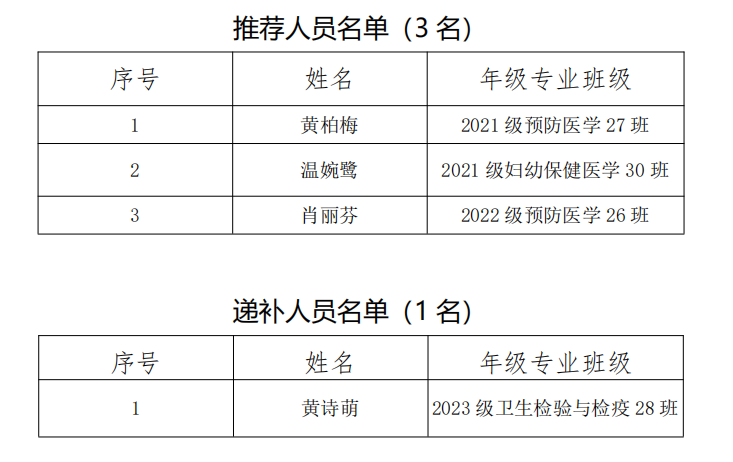 根据《太阳集团tyc138关于做好2024—2025学年本专科学生国家奖学金评审工作的通知》精神,太阳集团tyc138本着公平、公正、公开的原则,经过学生申请、班级初评和学院评审,同意黄柏梅等3名同学为本专科学生国家奖学金推荐人选,同意黄诗萌等1名同学为学年本专科学生国家奖学金递补人选,若推荐名额出现空缺,将按照递补名单顺序依次递补。现将名单公示如下: