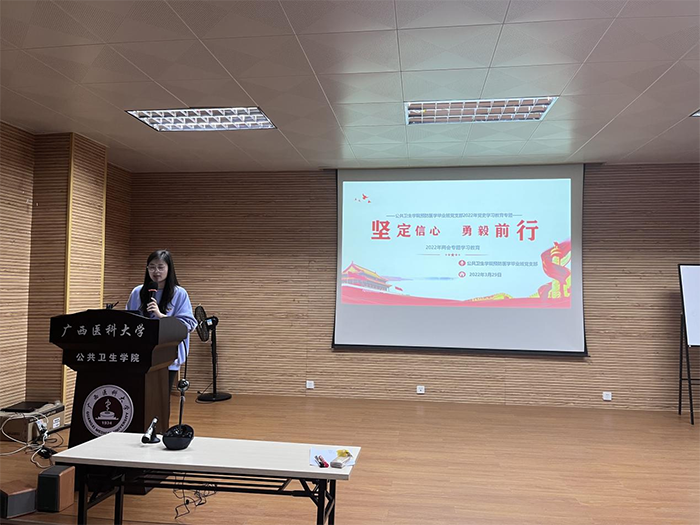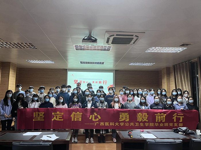 为深入贯彻学习2022年全国“两会”精神,增强党员同志们的使命感和责任感。2022年3月29日晚,太阳集团tyc138预防医学毕业班党支部开展“坚定信心,勇毅前行”主题党日活动。预防医学毕业班党支部正式成员、预备党员、积极分子共55名同志参加,活动由支部书记郑冬婷主持。
