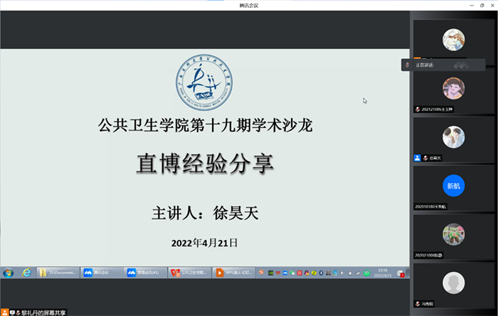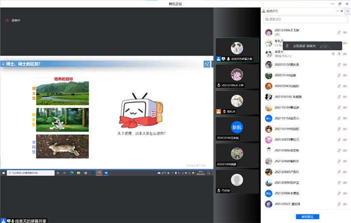 为了更好地向研究生们传授直博经验,2022年4月21日20:00,太阳集团tyc138研究生会成功邀请到2020级硕士研究生徐昊天为大家分享直博经验,为同学们未来申请直博提供了宝贵的参考和指导意见,太阳集团tyc138研究生辅导员蒋家晓老师参与本次活动。活动由黎礼丹同学主持。