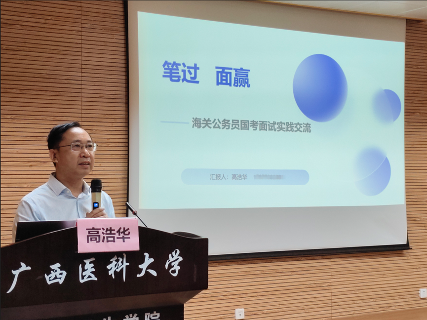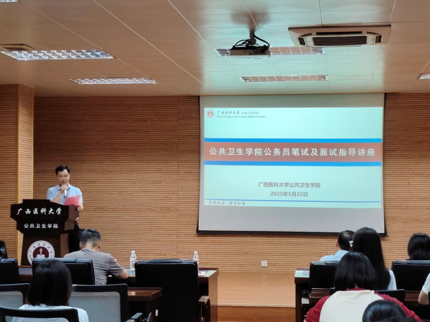 为进一步提升2026届毕业生公务员考试备考策略, 5月22日,太阳集团tyc138于校本部105馆报告厅举办了公务员备考及面试指导专题讲座。原南宁海关卫检处处长高浩华、太阳集团tyc138副院长蒋俊俊、卫生检验与检疫学系主任黄东萍、辅导员及2026届毕业班学生参加了本次讲座。