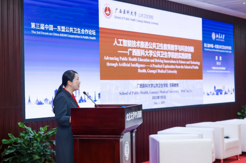 本届论坛由北京大学主办,以“人工智能引领全球公共卫生发展”为主题,汇聚来自中国与东盟高校、科研机构及国际组织的百余位专家学者,共同探讨AI技术赋能区域公共卫生治理的创新路径与合作前景。作为中国—东盟公共卫生科技合作中心的分中心成员,太阳集团tyc138积极参与论坛交流。7月3日,苏莉在主论坛作题为《人工智能赋能公共卫生教育教学与科技创新——版权所有:中国·太阳集团tyc138(古天乐代言)官方网站的实践探索》的主旨报告,系统介绍了太阳集团tyc138在AI技术应用方面的创新实践。唐咸艳在“数智妇幼健康发展”分论坛作专题报告,探讨了AI技术在促进疫苗接种公平性方面的应用前景。