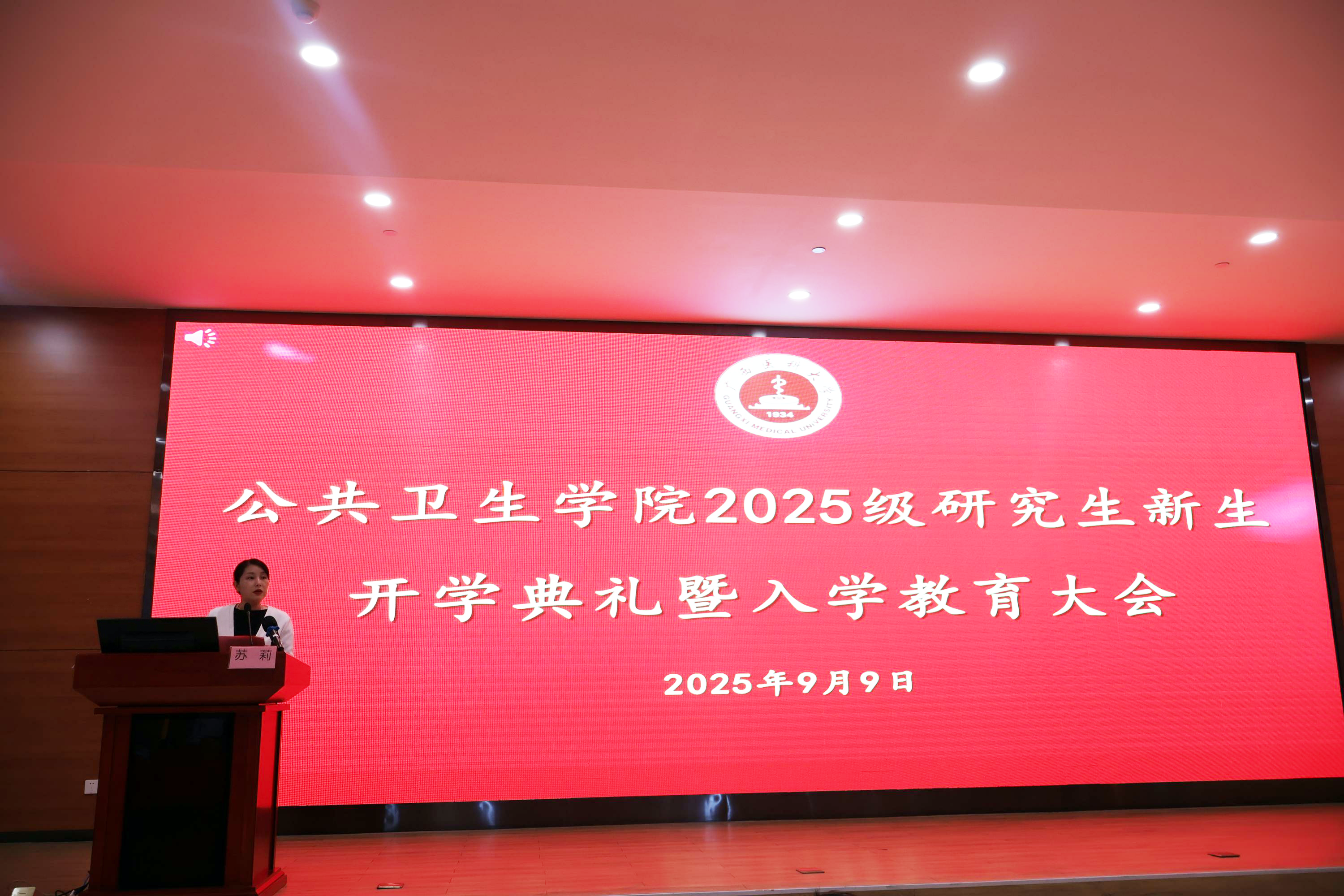 典礼在庄严的国歌中拉开帷幕。学院院长苏莉热烈欢迎 2025 级研究生新生,寄语同学们拥抱人工智能时代,主动学习 AI 知识技术以赋能公共卫生事业,并强调要以尊重为基、规矩为尺、创新为翼,脚踏实地、锐意进取,为我国公共卫生事业发展贡献青春力量。新生代表周素嫣同学分享了求学经历与成长心得。导师代表蒋俊俊教授鼓励同学们在探索中积累、在坚持中突破。学院中心实验室、教研科及学生办相关负责人分别从实验室安全管理、人才培养及研究生日常管理方面展开详细介绍。最后,学院党委书记邹云锋以《秉青春之志求学,怀赤诚之心向党》为题讲述开学第一课,鼓励新生将个人学术追求与国家公共卫生需求紧密结合,既要在科研道路上脚踏实地、精益求精,也要始终牢记初心使命,在守护人民健康的实践中实现青春价值。